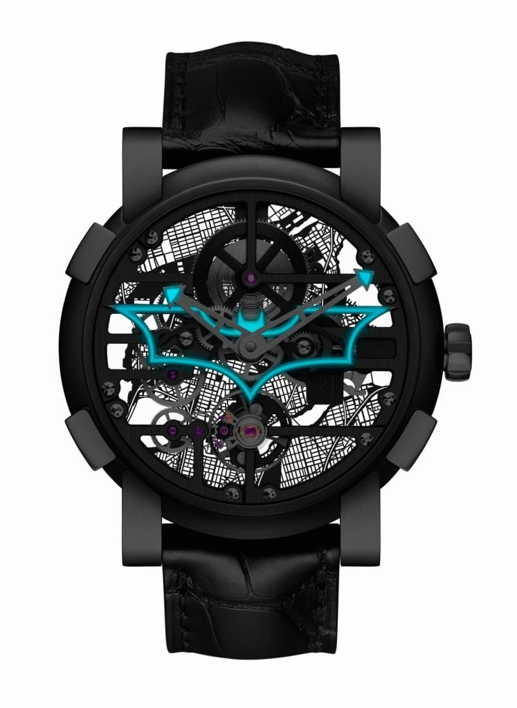 HAUTLENCE vortex gamma magma Boîtier en titane grade 5 HLLightColor orange et noir, 52 x 50 x 18 mm. Mouvement automatique manufacturé, calibre HL2.0 avec train de rouage et système de remontage spécifique. Heure sautante affichée par une chaîne, minute rétrograde, mouvement baguette mobile. 40 heures de réserve de marche. Bracelet en cuir d’alligator de Louisiane.RJ-ROMAIN JEROME Skylab Batman Boîtier en acier PVD noir de 48 mm, cadran applique Batman squelettée en chrome noir sablé remplie de Super-Luminova® noir C1 à « émission bleue ». Dos du boîtier avec carte de Gotham City métallisée sur glace saphir. Mouvement manuel, calibre RJ004-M. 48 heures de réserve de marche. Bracelet en cuir d’alligator noir.CHRISTOPHE CLARET Maestro Mamba Boîtier en titane grade 5 PVD noir de 42 mm. Mouvement manuel, calibre DMC16. Grande date pyramidale à 5h, affichage des dizaines sur le cône supérieur, affichage des unités sur le cône inférieur. Fonction MEMO à 3h30 : forme conique dotée d’une tsavorite (version Mamba vert) ou d’un saphir (version Pantherophis orange) et d’un diamant permettant de rappeler l’engagement. 7 jours de réserve de marche. Bracelet en serpent Mamba vert. 28 exemplaires.ARMIN STROM Mirrored Force Resonance Guilloché Dial Boîtier en acier de 43,4 mm. Cadran annulaire guilloché bleu avec appliques apposées. Mouvement manuel de manufacture, calibre ARF15. Ressort d’embrayage de résonance, affi chage jumelé des secondes, indications de temps décentrées. 48 heures de réserve de marche. Livrée avec bracelet noir en véritable cuir d’alligator « horn-back » avec boucle ardillon en acier inoxydable et un second bracelet en caoutchouc noir. Boucle déployante à deux dépliants en acier disponible en option.