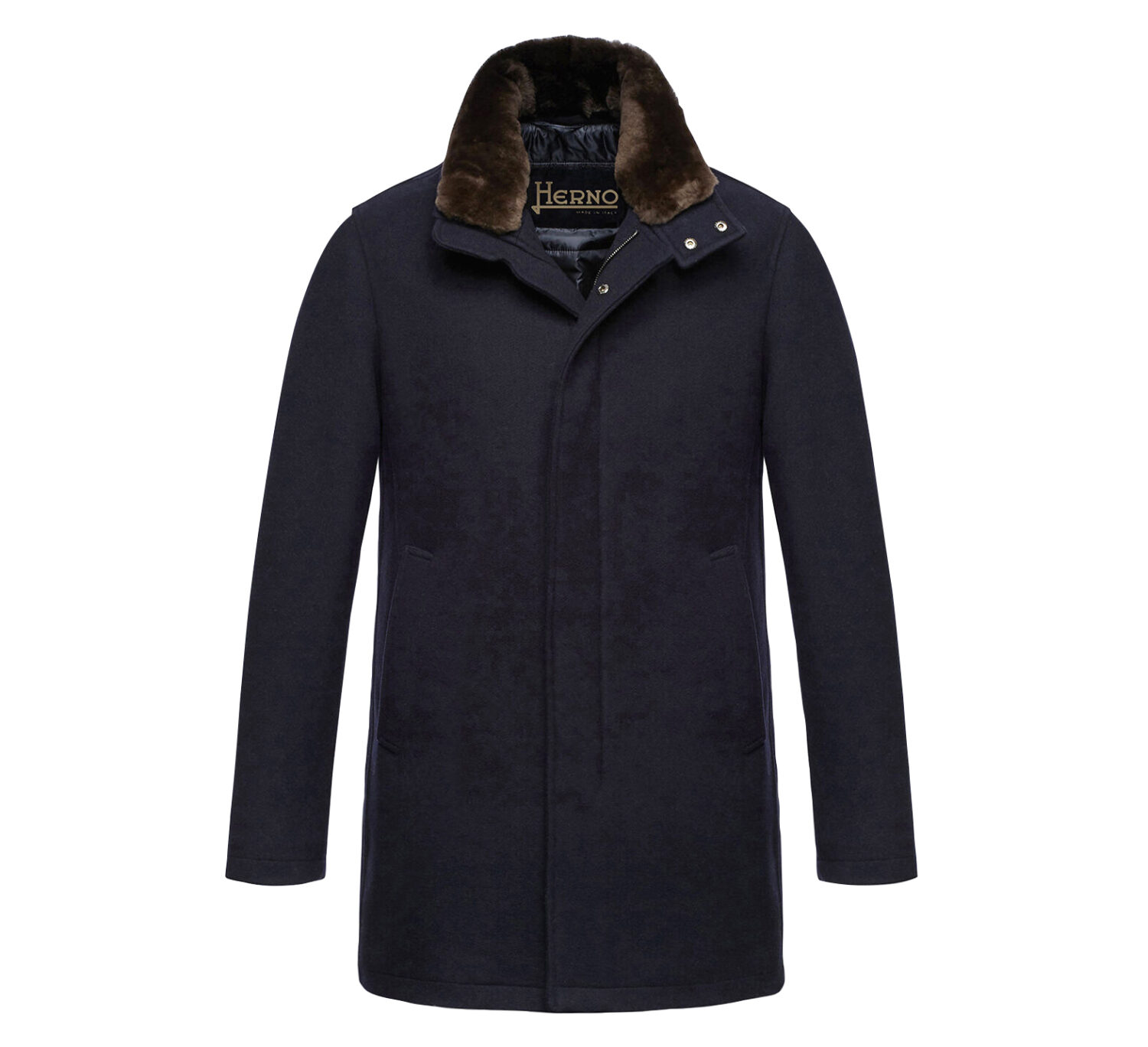 Manteau en laine avec col en fourrure, doublure en toile technique isolante, prix sur demande, Herno chez Sirecci.