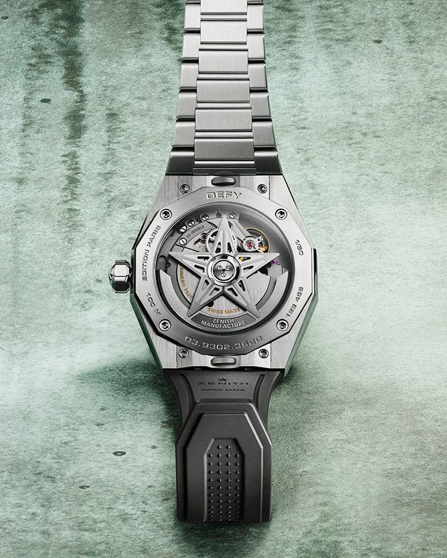 Cette montre rend hommage à la première Zenith Defy de 1969 avec un cadran au dégradé concentrique et une lunette facettée. La couleur vert-de-gris du cadran apporte une profondeur unique au motif du ciel étoilé, signature de la collection. Cette teinte évoque la patine du cuivre des toits parisiens, des bâtiments historiques et des entrées de métro de style Art nouveau.