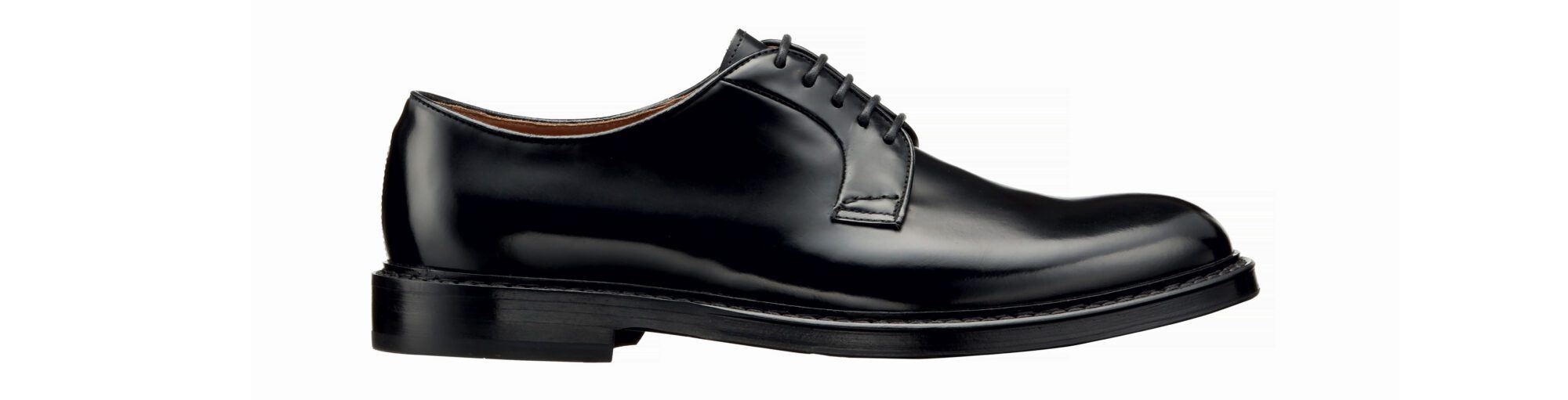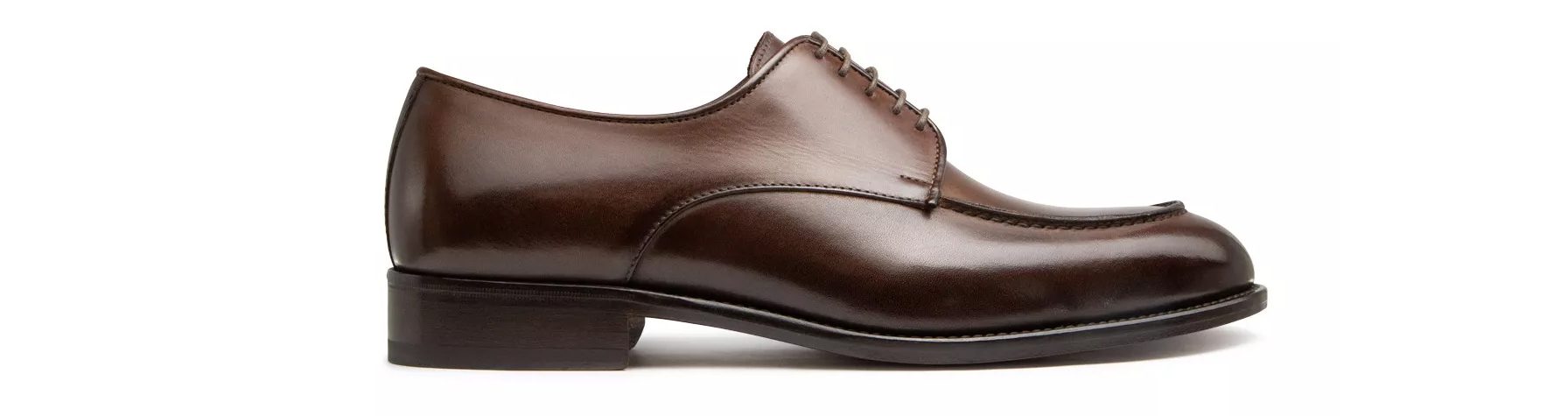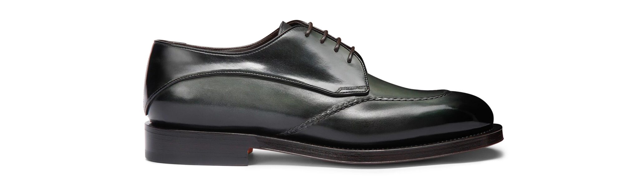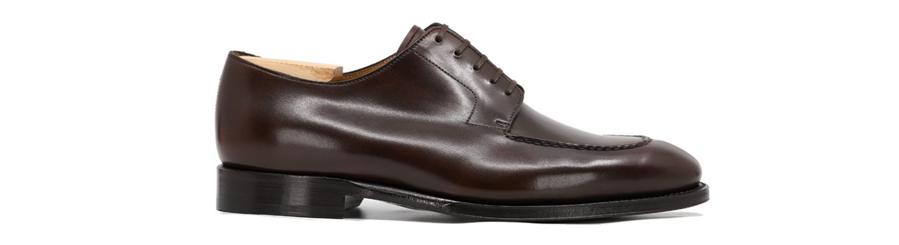 Derby, cuir avec patine Velatura, couture norvégienne, cousu Goodyear, semelles cuir, 1 150 €.