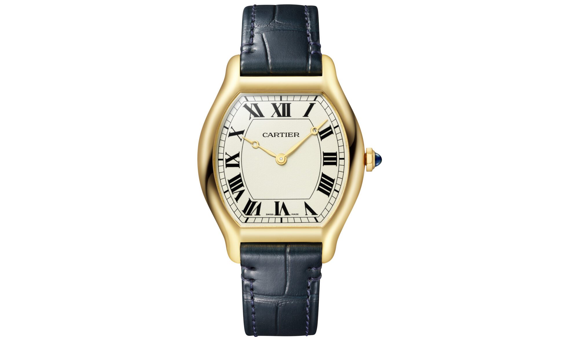 7- Montre Cartier Privé Tortue, boîtier en or jaune de 41,4 x 32,9 mm, couronne à pans sertie d’un cabochon saphir, mouvement mécanique à remontage