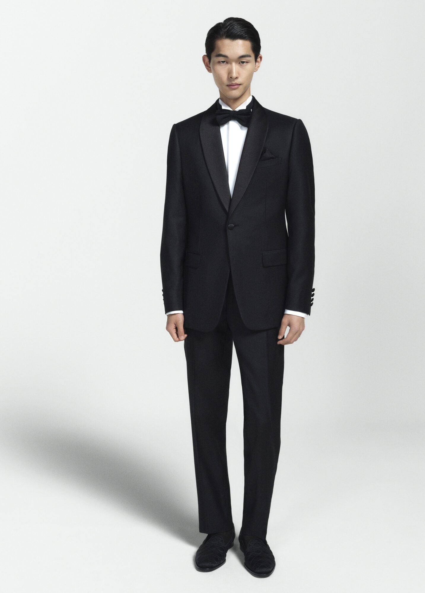 5- Smoking en laine vierge et micro-jacquard de soie à col châle, chemise de smoking en Dobby de coton, col cassé, plastron arrondi et poignet français, nœud papillon en velours, carré de poche en soie micro-cannage, slippers Dior Timeless en nylon satiné à motif cannage, semelle en cuir, prix sur demande, Tailoring Capsule Dior Men.