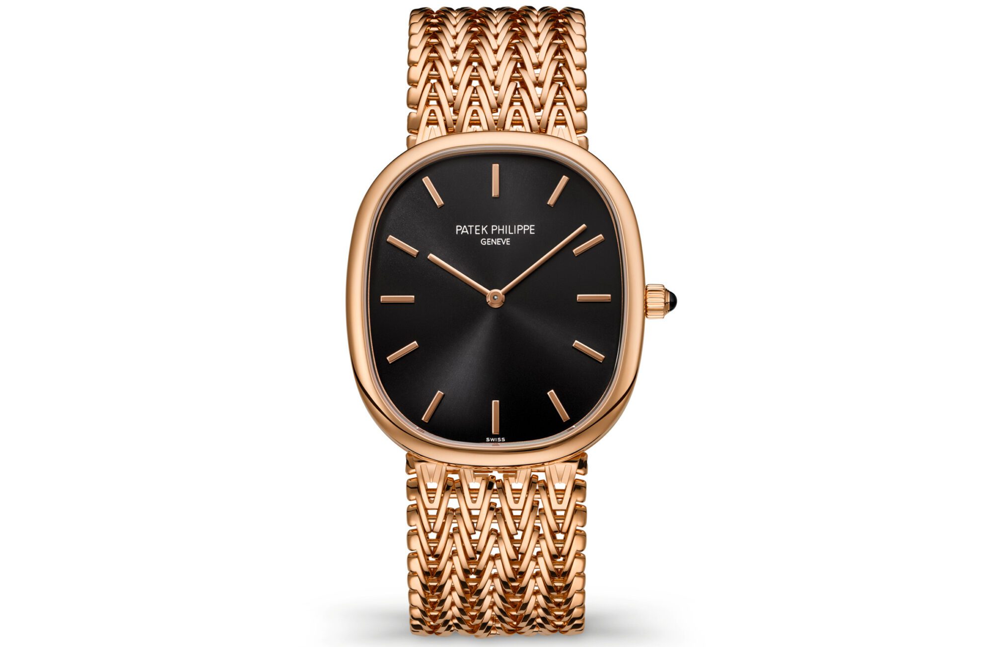 10- Montre Golden Ellipse, boîtier en or rose de 34,5 x 39,5 mm, mouvement automatique (calibre 240), bracelet en mailles d’or rose montées à la main, 59 600 €, Patek Philippe.