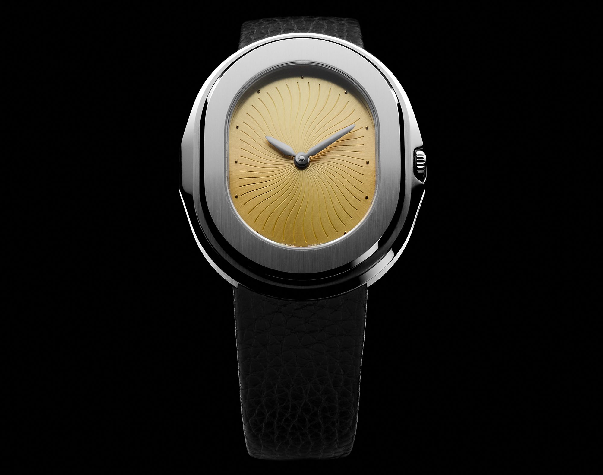 8- Montre Parade, référence 1174, boîtier de forme « Stadium » de 35 x 41 mm, cadran soleillé et guilloché radial en S, mouvement automatique (calibre SoProd M100), étanche à 100 mètres (1 490 €), Serica.