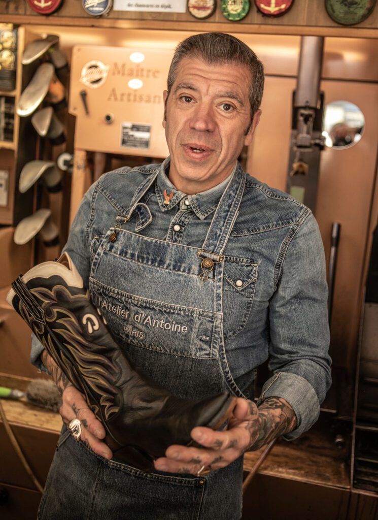 C’est qu’il a de la suite dans les idées Antoine Rondeau, et pas la langue dans sa poche ! Depuis l’âge de 14 ans, il n’a qu’une seule envie, c’est travailler. Trop jeune ? – « L’artisanat en 1977 ? Une blague ! ». Il obtiendra une dérogation pour un apprentissage chez un maître cordonnier à Nantes, la ville dont il est originaire. « L’abattage, ce n’est pas pour moi, je voulais faire du traditionnel », glisse-t-il. Et comme la vie n’est faite que de rencontres, Dick Rivers – dont il conserve précieusement une paire de bottes confiées par son épouse –, Johnny Halliday, Sofiane Pamart, Jacquemus… font partie de son carnet de bal. La plus petite botte au monde ?