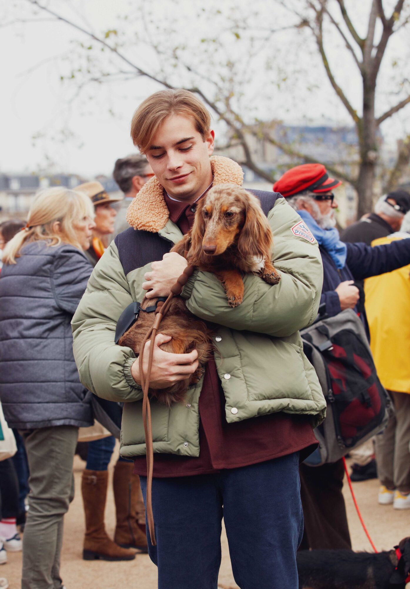 Chaque toutou semble s’être mis sur son 31. Ici, Giorgio avec nœud papillon et costume – « celui de notre mariage », confient encore émus ses deux maîtres. Là, Charly avec un pull Ralph Lauren brodé du drapeau américain. Plus loin, Lewis en veste matelassée Barbour – « la même que son papa », précise son propriétaire. À deux pas, ou plutôt, à deux pattes, Margot, une « teckelette » à poil dur, vêtue de sa cape rouge bordée de fausse hermine et d’une couronne sur la tête.