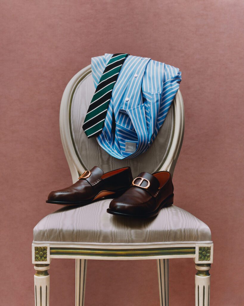 Plus loin, les loafers Dior Archies aux accents preppy. Une belle sélection de pièces de prêt-à-porter est également mise en avant, composée d’essentiels et de couleurs. Les univers masculin et féminin se répondent tandis que le riche passé de la maison dialogue avec l’avenir et les nouveaux codes réécrits par le créateur iconoclaste.